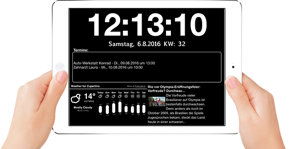The Smart Mirror Tool is the ONLY ONE app show: time, date , calendar weeks , date , news, weather on a display.